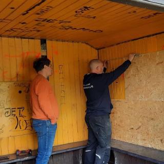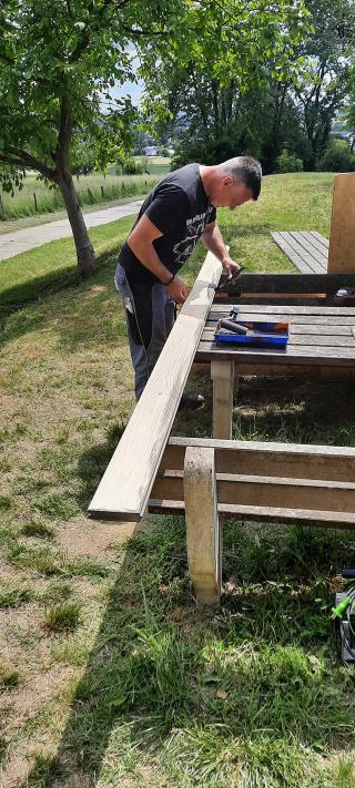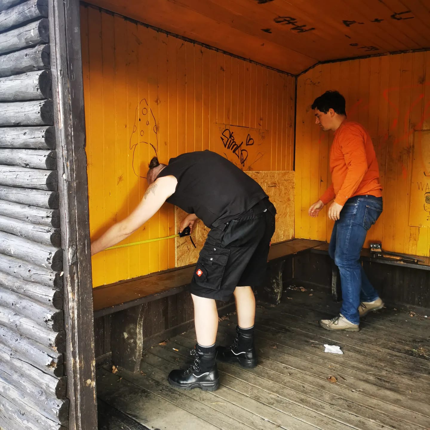 - Eine Minute - 84 WörterAus demoliert und beschmiert wird wieder neu. 22 Std Arbeit mit 8 Landmännern und eine knapp 4 stellige Summe und das Ergebnis lässt sich sehen. Hoffentlich wird sie nicht wieder mutwillig beschmiert und zerstört. Das Muttertagshüttchen dient allen als Schutzhütte und ist auch ein schöner Ort zum Entspannen und Genießen. Das muss einfach erhalten werden. Wenn wir wieder etwas spenden gesammelt haben soll es an die Außenverkleidung gehen, da diese umbedingt mal sandgestrahlt werden muss und eine neue Holzlasur vertragen könnte.